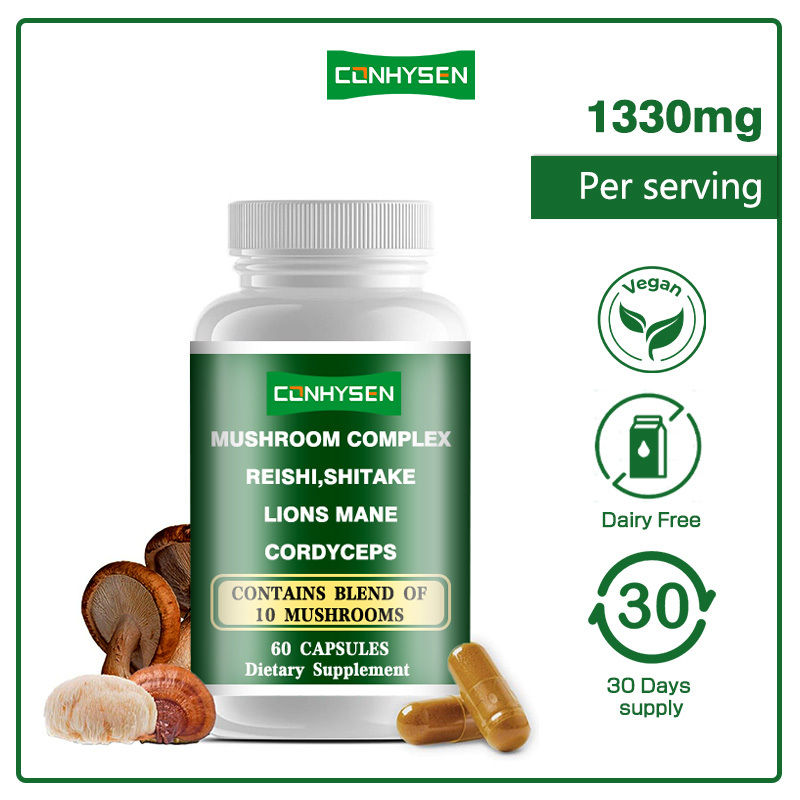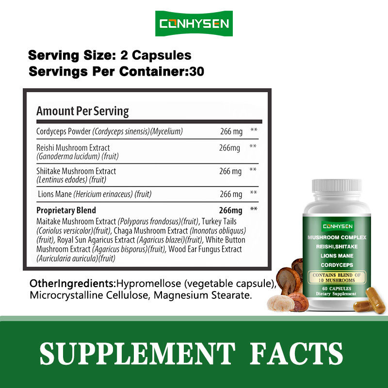 Pilzkomplexkapseln sind Nahrungsergänzungsmittel, die wissenschaftlich aus verschiedenen funktionellen Pilzen wie Reishi, Shiitake, Lingzhi Mycelium und Tremella formuliert und verfeinert wurden.Es enthält wertvolle Wirkstoffe wie Polysaccharide, Terpenoide, Ergothionein und Mineralstoffe aus diesen Pilzen, die als natürliche Gesundheitsaufbewahrung dienen und den menschlichen Körper mehrdimensional schützen.