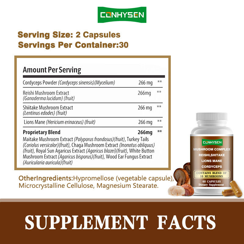 Mushroom Complex Capsules ist ein Nahrungsergänzungsmittel, das die Essenz verschiedener Heilpilze kombiniert.Es ist aufgrund seiner einzigartigen natürlichen Formel und seiner umfangreichen gesundheitlichen Vorteile bei modernen Verbrauchern sehr beliebtDiese Produkte enthalten typischerweise Extrakte von traditionellen Heilpilzen wie Reishi, Cordyceps, Tremella und Auricularia.und werden in wissenschaftlichen Verhältnissen in leicht absorbierbare Kapselform formuliert, die eine bequeme Nahrungsergänzungslösung für diejenigen bietet, die einen gesunden Lebensstil suchen.