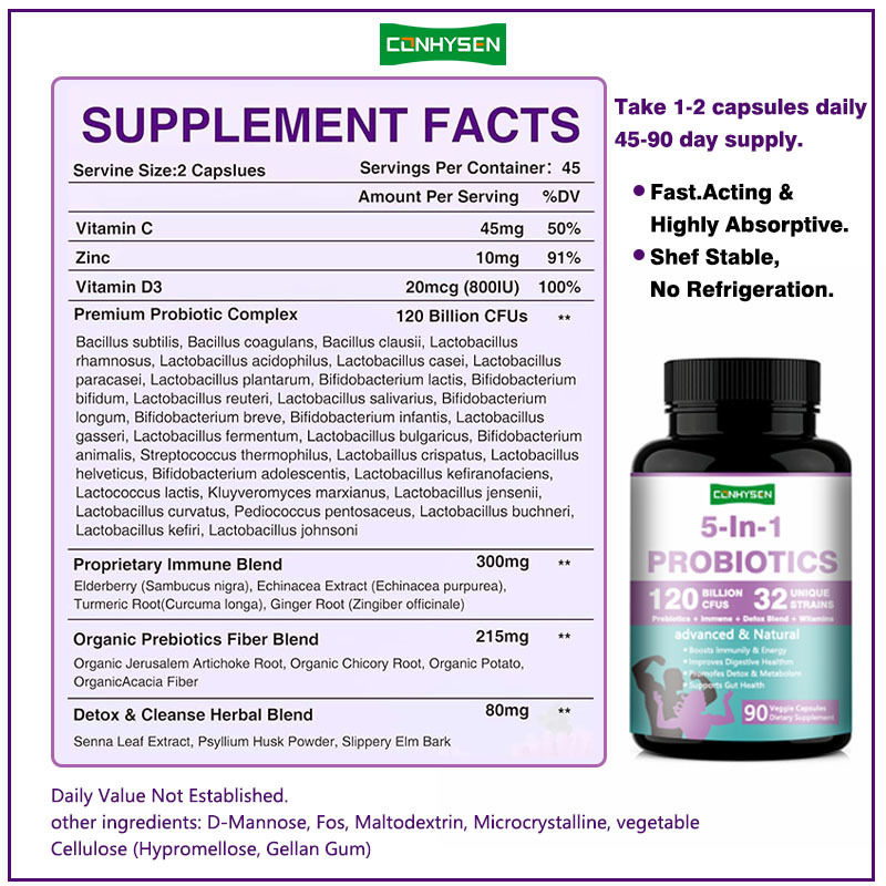 Privatetiketten 5-in-1 Präbiotische Kapseln fördern Entgiftung und Stoffwechsel Probiotische Ergänzungen