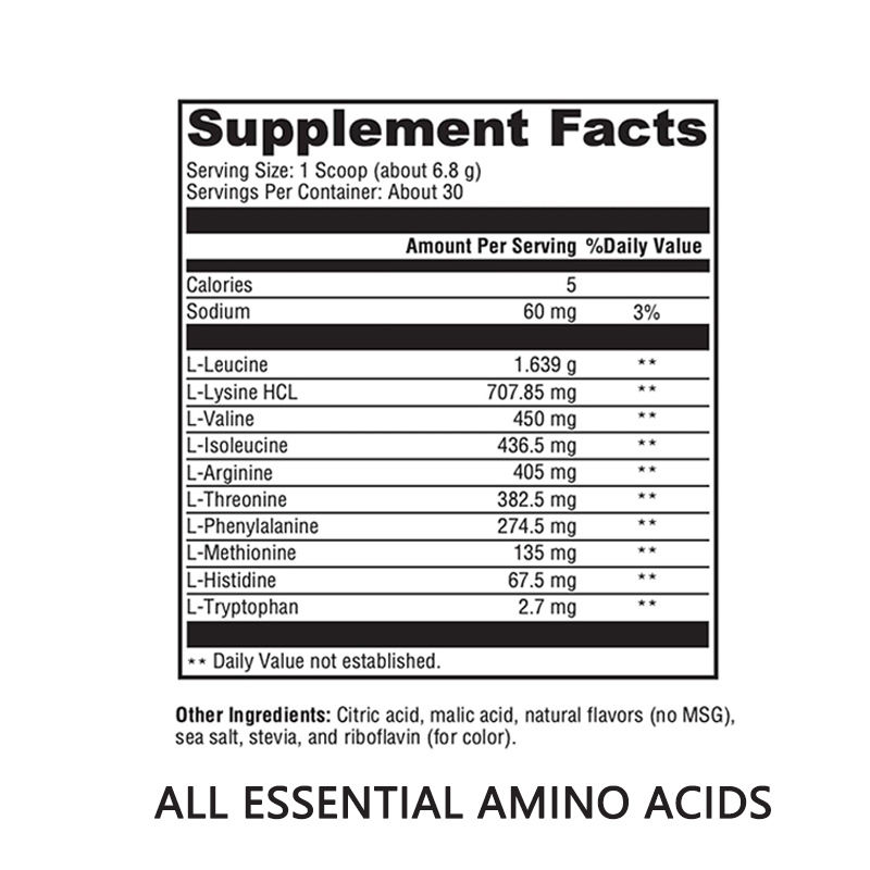 L-Leucin, L-Soleucin, L-Valin, L-Lysin HCL, L-Arginin, L-Threonin, L-Phenylalanin, L-Methionin, L-Histidin, L-Tryptophan