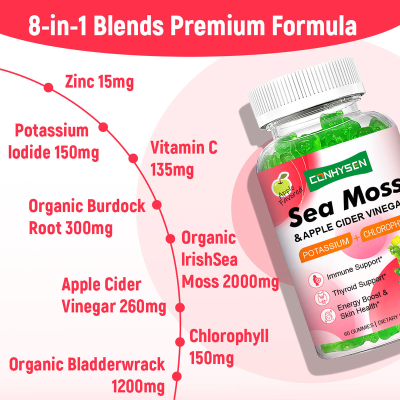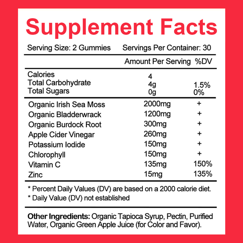 Biologischer Irischer Meeresmoos, Vitamin C, Zink, biologische Blasenwurzeln, biologische Burdockwurzeln, Apfelessig, Kaliumjodid, Chlorophyll