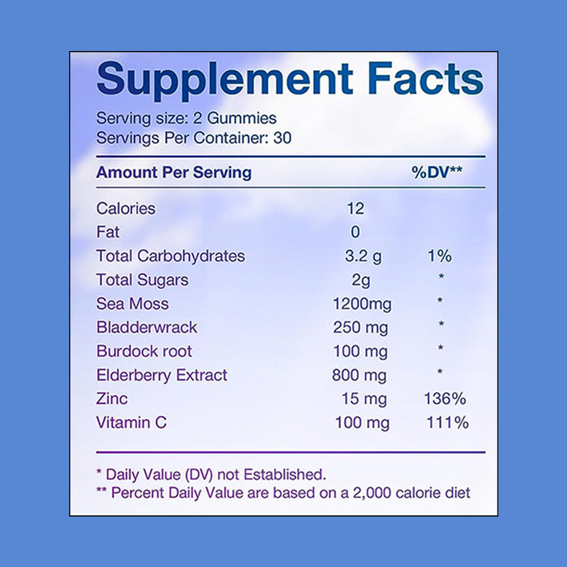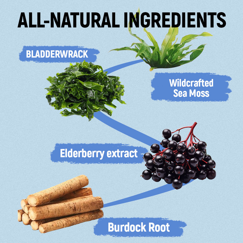 Sea Moss, Blasentang, Klettenwurzel, Holunderbeerenextrakt, Zink, Vitamin C