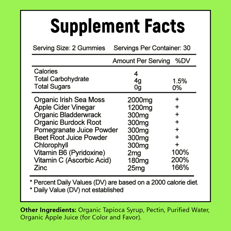 Biologischer Irischer Meeresmoos, Bio-Blasenwurzel, Bio-Burdokwurzel, Apfelessig, Granatapfelsaftpulver, Rübenwurzelsaftpulver, Zink, Vitamin B6, Vitamin C, Chlorophyll