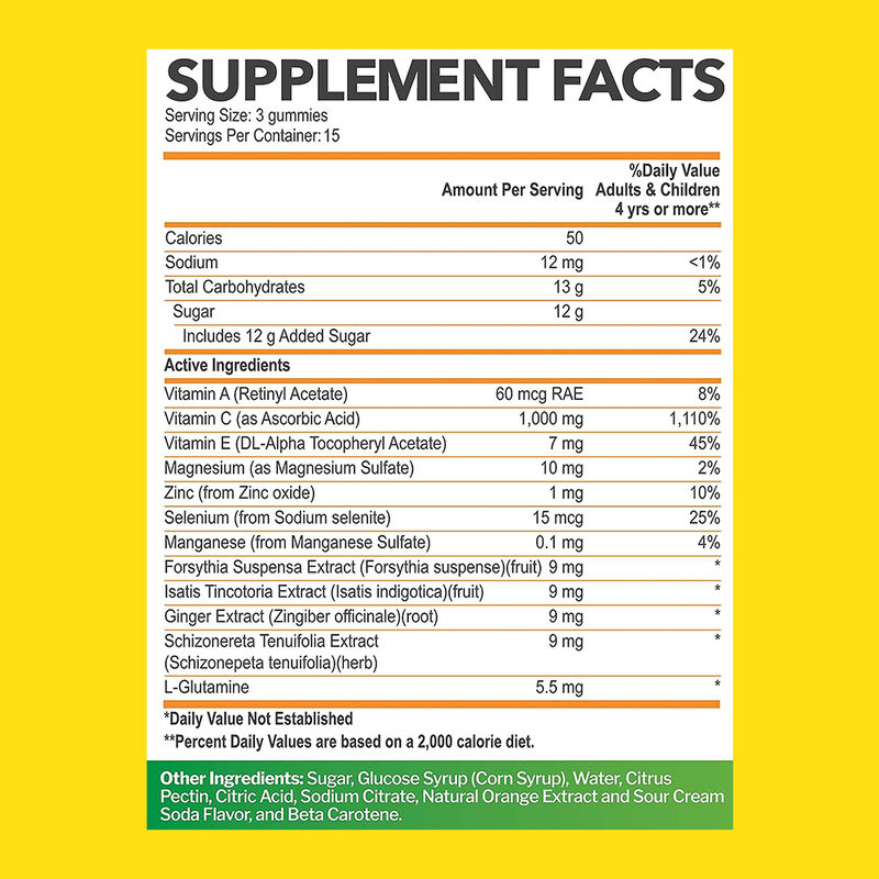 Vitamin C, Vitamin A, Vitamin E, Zink, Magnesium, Selen, Mangan, Ingwer-Extrakt, Forsythia Suspensa-Extrakt, Isatis Tincotoria-Extrakt, Schizonereta Tenuifolia-Extrakt, L-Glutamin