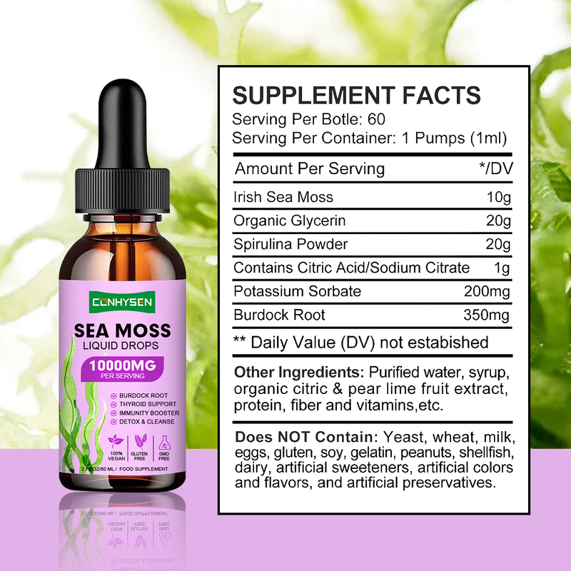 Die von Guangdong Kangsheng Pharmaceutical Technology Co., Ltd.hergestellten Sea Moss Flüssigkeitstropfen sind reich an natürlichem Jod und verschiedenen Mineralien, die die Schilddrüse mit entscheidender Nährstoffunterstützung versorgen können. Die Schilddrüse, als eine wichtige endokrine Drüse im menschlichen Körper, deren Gesundheit sich direkt auf den Stoffwechsel, das Energieniveau und die emotionale Stabilität auswirkt. Unser Produkt verwendet irischen Seetang, der aus dem reinen Meeresgebiet gewonnen wird und einem wissenschaftlichen Extraktionsprozess unterzogen wird, um die Wirkstoffe zu erhalten und so zur Aufrechterhaltung der normalen Sekretion von Schilddrüsenhormonen beizutragen.