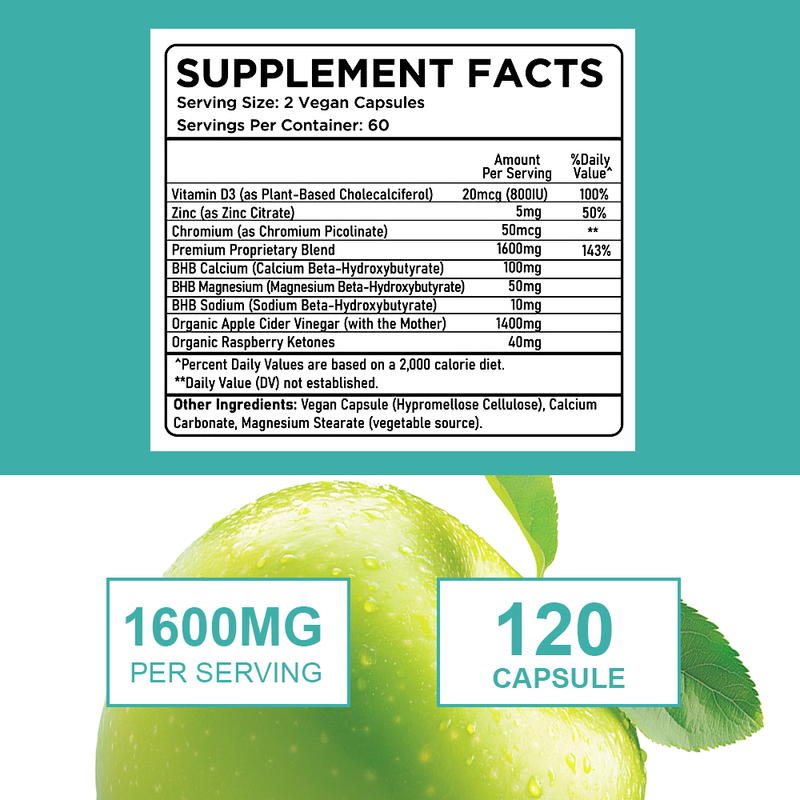 Bio-Apfelessig, Vitamin D3, Zink, Chrom, Premium-Eigentumsrezeptur, BHB Calcium, BHB Magnesium, BHB Natrium, Bio-Himbeer-Ketone