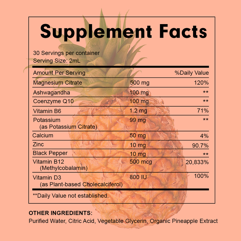 Magnesiumsitrat, Ashwagandha, Coenzym Q10, Vitamin B6, Kalium, Kalzium, Zink, Pfeffer, Vitamin B12, Vitamin D3